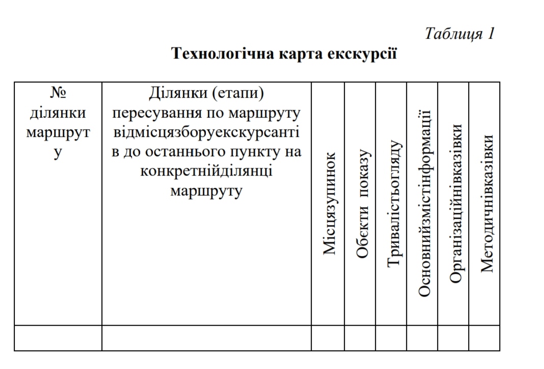1. Охарактеризувати вимоги, яким має відповідати технологічна карта екскурсії . За наведеною схемою скласти технологічну карту екскурсії певної тематики.