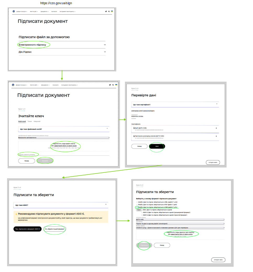 Як користуватися е-підписом (загальна інформація): https://youtu.be/09NuX02a2wE або  https://czo.gov.ua/sign